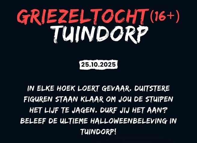 Op zaterdag 25 oktober verandert Tuindorp in een plek vol spanning en mysterie. Het Wijkcentrum Tuindorp organiseert de spannendste Griezeltocht van Hengelo! Tijdens een route van ca. 3 kilometer nemen we je mee langs de donkerste paadjes en verrassende plekken in de wijk. Onderweg kom je griezelige verschijningen, onverwachte ontmoetingen en mysterieuze taferelen tegen.