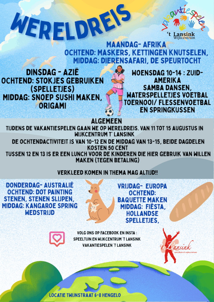 De zomervakantie staat voor de deur en dat betekent: de Vakantiespelen gaan weer van start! Van maandag 11 tot en met vrijdag 15 augustus organiseert speeltuin en wijkcentrum ’t Lansink een creatieve en avontuurlijke week voor kinderen van 4 tot en met 12 jaar. Het thema dit jaar: wereldreis.